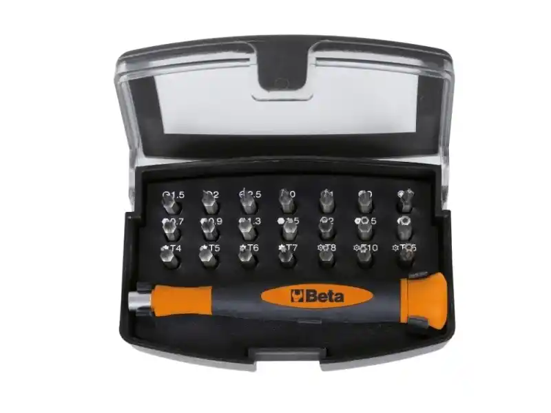 Beta BW 1256/C21-1, mini çift malzemeli tornavida, karışık baskılara sahip 21 adet değiştirilebilir 4 mm uç ve manyetik bir uzatma içeren küçük bir settir. Kompakt boyutu, hassas işleri kolayca gerçekleştirmenizi sağlar .