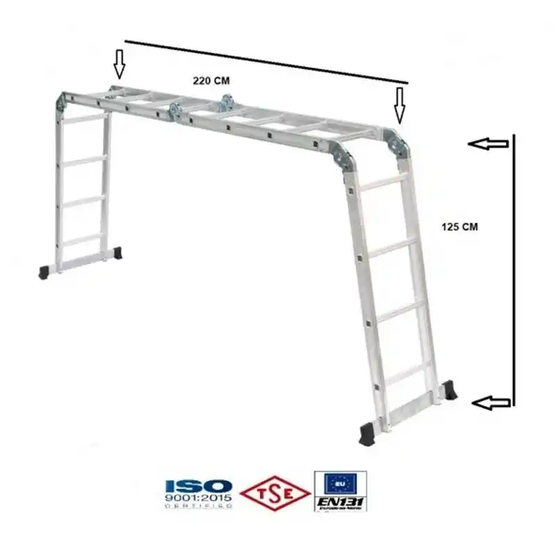 Teknik Özellikler Kırılım Sayısı:4 Adet Basamak sayısı:16 Adet Ağırlık:13.250 Kg Taşıma Kapasitesi:150 Kg Merdiven profili kalınlığı:1.2 mm Merdiven Basamak uzunluğu:35 cm Kaymayı Önleyen pabuç: Var Kapalı halde Boyu:125 cm Düz Açık Halde Boyu:4.70 Mt L Tipi Halde boyu:3.40 Mt Merdiven Genişliği:28 Cm Basamak adedi:4x4 adet Profil Ölçüsü:60x25 mm