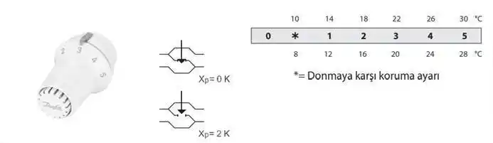 Sıcaklık ölçekleri Avrupa standartlarına göre Xp =2°C şeklinde belirtilmektedir. Buna göre, radyatör termostatları sıcaklık ölçeklerinde belirtilen sıcaklıktan 2°C daha yüksek bir sensör sıcaklığında kapanır.