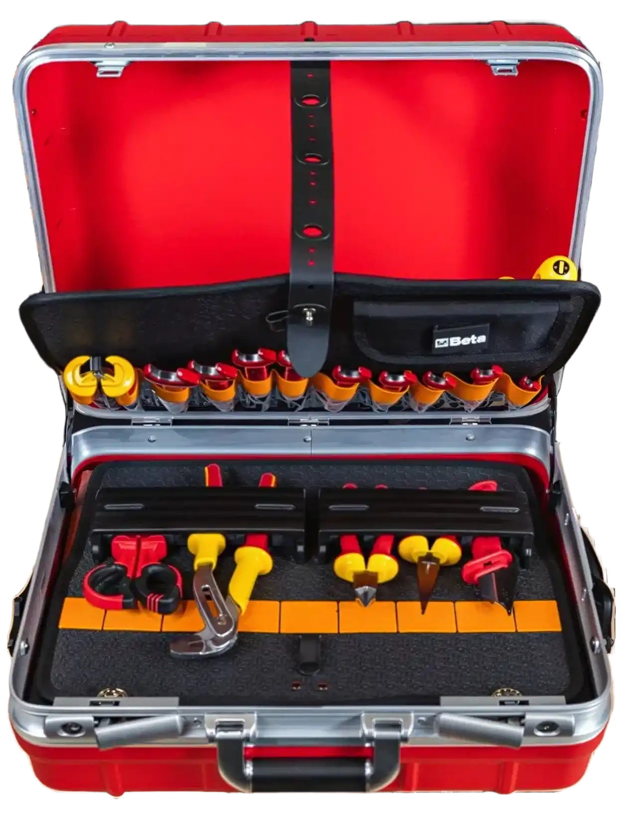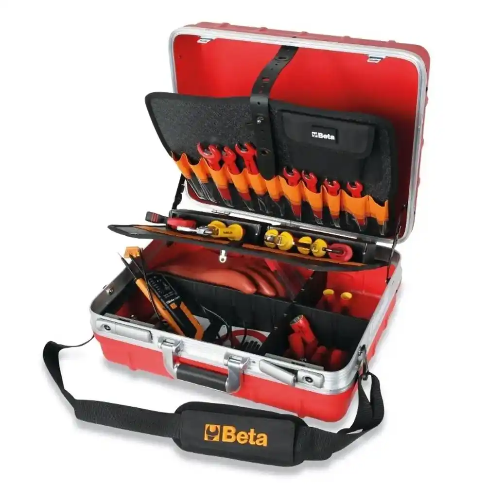 Beta 2029EM, hibrit ve elektrikli araçların (EV) bakımı için özel olarak seçilmiş, 1000V izoleli 42 parça el aletini içeren, darbelere dayanıklı ve tekerlekli profesyonel bir dolu takım çantasıdır.
