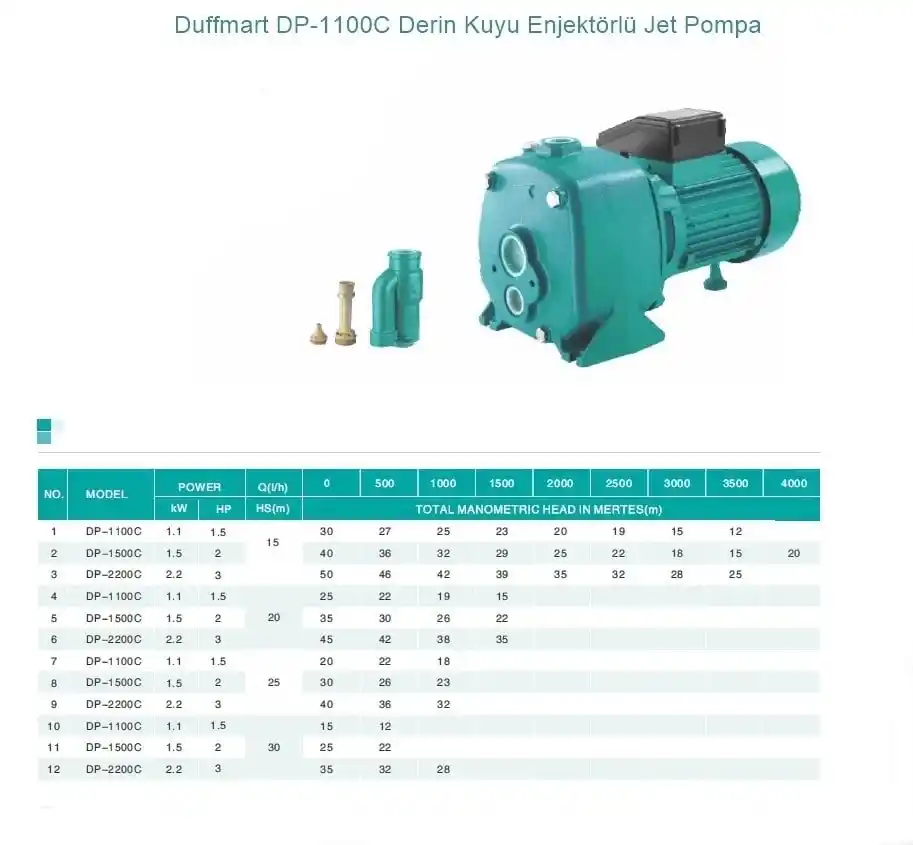 | Teknik özellikler | Duffmart DP-1100C Derin Kuyu Enjektörlü Jet Pompa |