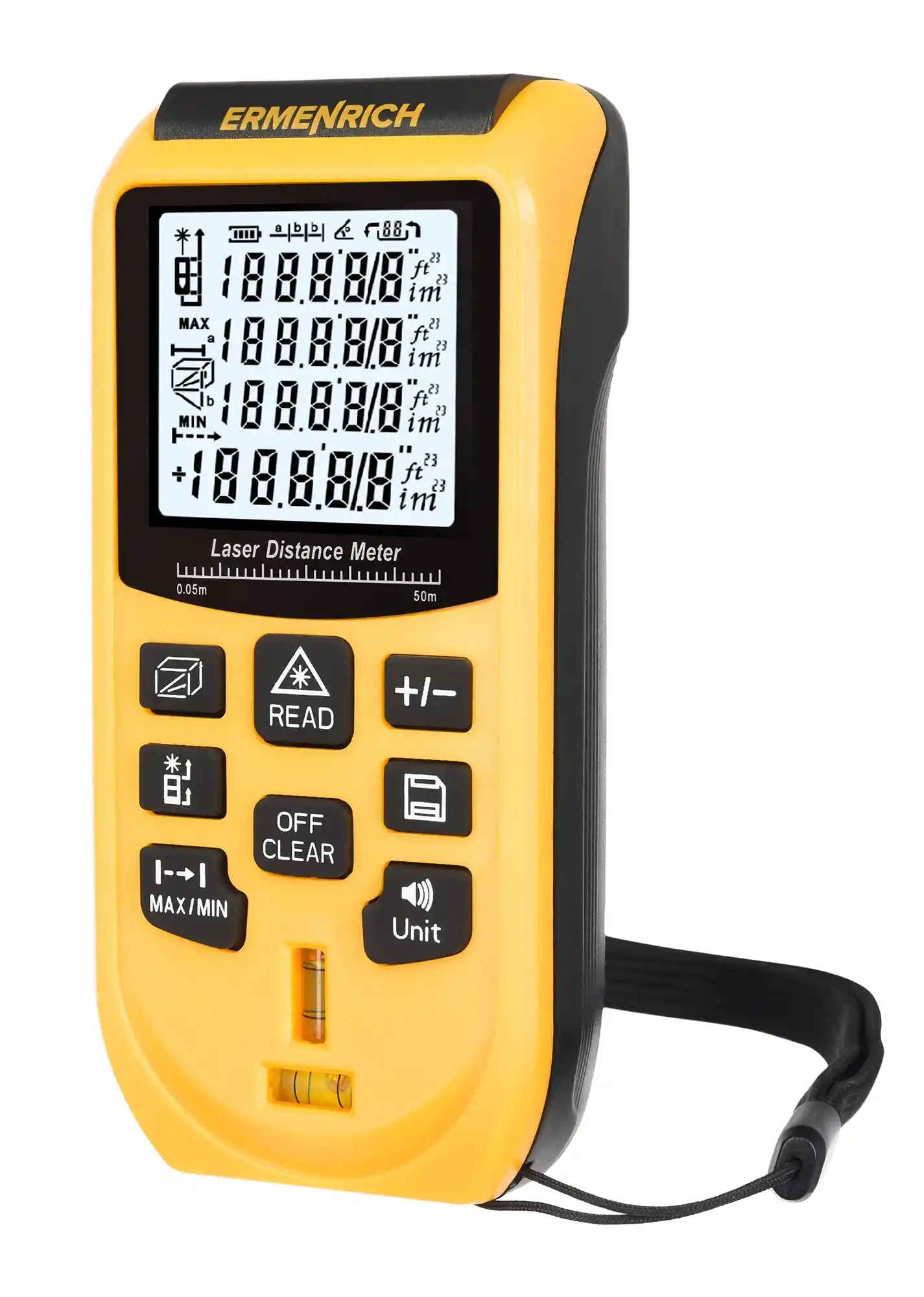 Ermenrich Reel BASE GA50 Lazer Metre şantiyelerde doğru ölçümler almak için gerekli bir alettir. Kabiliyetleri, örneğin bir apartman dairesinin yenilenmesinin yanı sıra endüstriyel ortamlarda da kullanışlıdır. Şerit metre, doğrusal ölçümler alabilir ve 50 metre içindeki mesafelerin yanı sıra alan ve hacmi ölçebilir. Pisagor teoremi özelliği, ara ölçümleri kullanarak her nokta arasındaki mesafeyi hesaplamanız gerektiğinde kullanışlı olur. Bu, odanın boyutları cihazı noktalardan birine yerleştirmenize izin vermiyorsa faydalıdır.