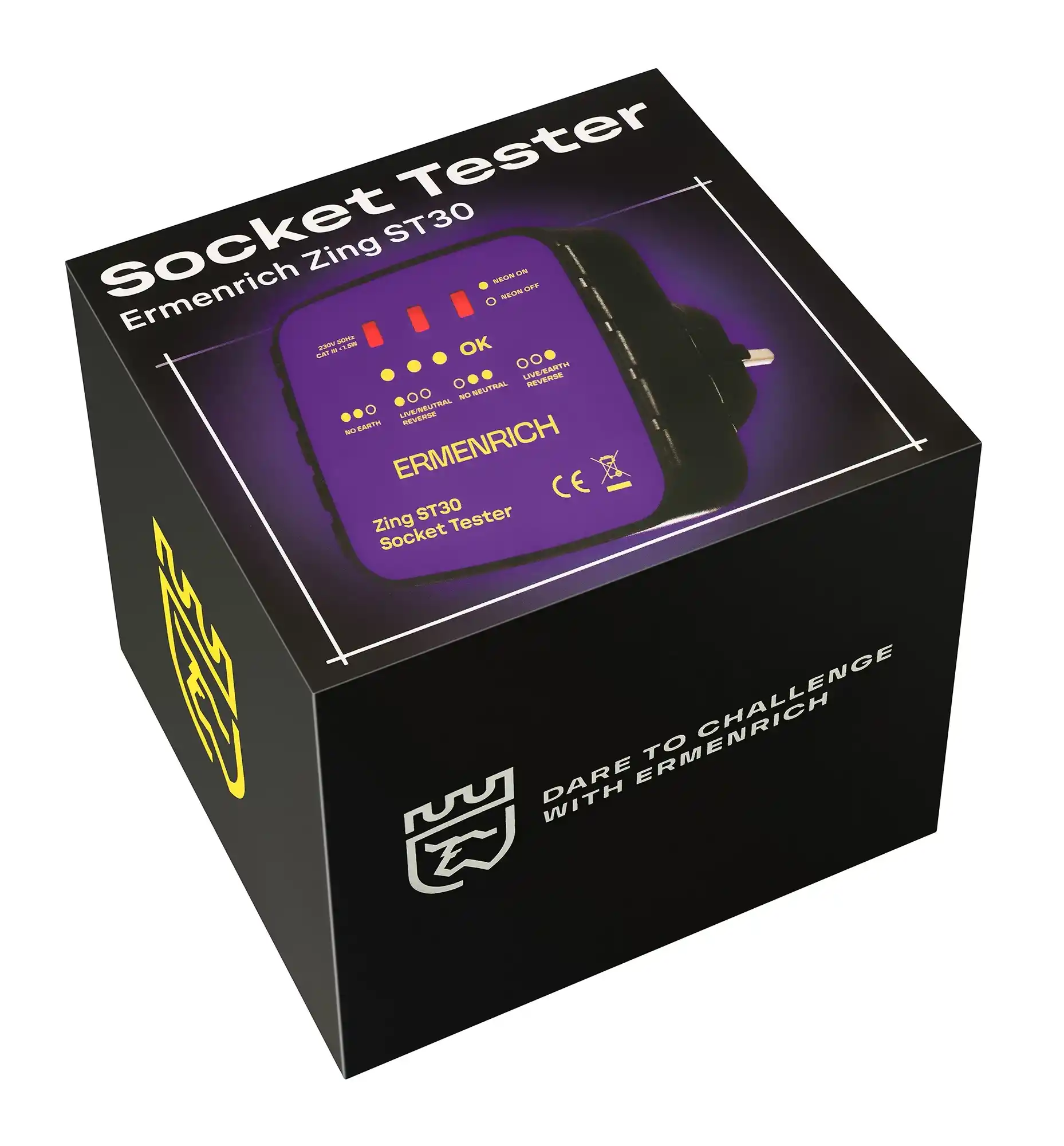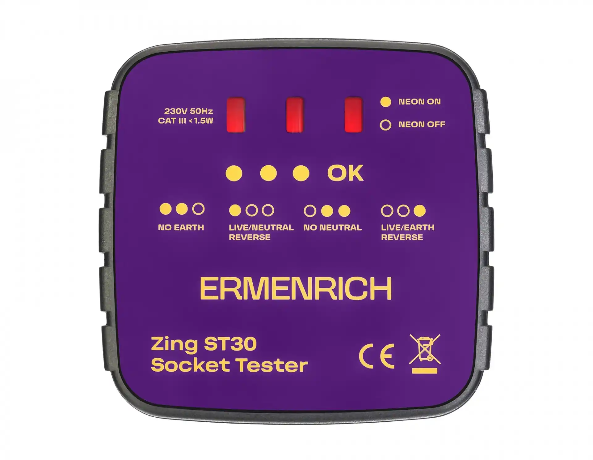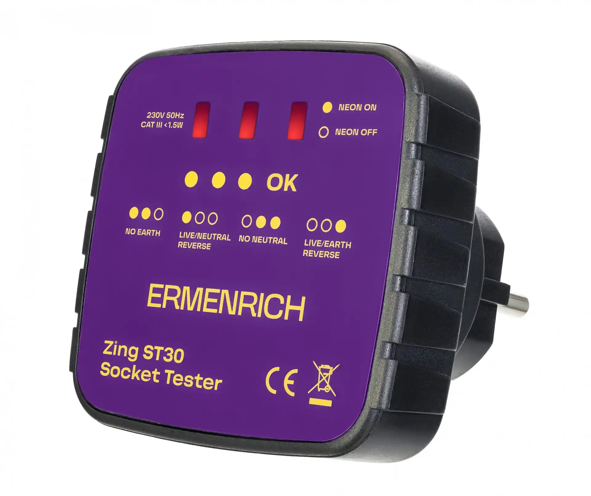 Ermenrich Zing ST30 Priz Test Cihazı, tüm prizlerin kablo bağlantılarının düzgün şekilde yapılıp yapılmadığını test etmek ve voltajı kontrol etmek için tasarlanmıştır. Test cihazı doğrudan bir prize takılmalıdır ve LED'in yanıp sönmesi çeşitli elektrik arızalarını gösterecektir: toprak yok/nötr yok, elektrik yüklü/nötr ters veya elektrik yüklü/toprak ters. Ek olarak, test cihazı ekranında görünen özel renk kodu, doğru kablolama durumunu gösterir. Her kodun işlevi cihaz üzerinde yazılıdır.