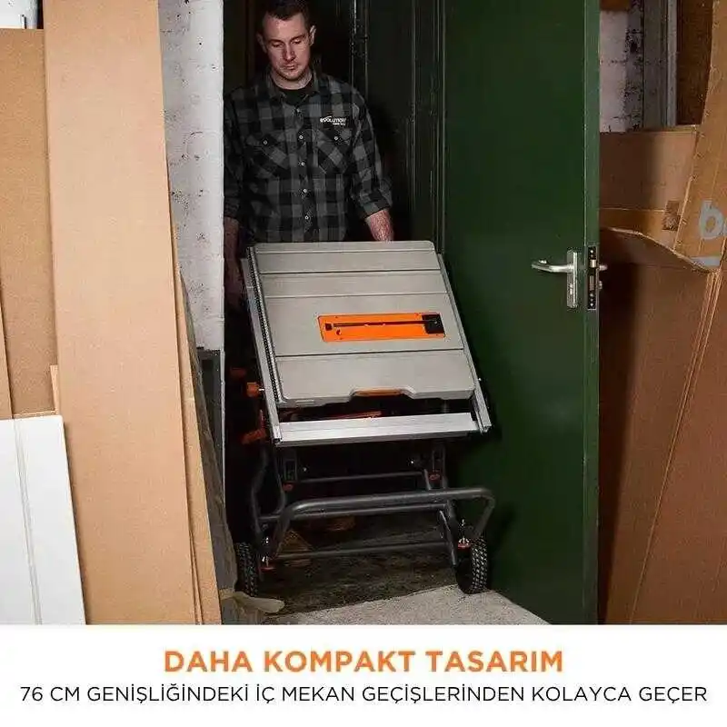 ● Daha taşınabilirdir; entegre taşıma kulplarına sahip hafif, yuvarlanabilir bir şasiye monte edilmiştir. Tekerlekli sehpası olmadan tek kişi tarafından kolayca taşınabilir ve büyük arazi tekerlekleri üzerinde son derece hareketlidir; standart genişlikteki iç kapılardan (76cm) kolayca geçerek mükemmel bir şantiye testeresi haline gelir.
