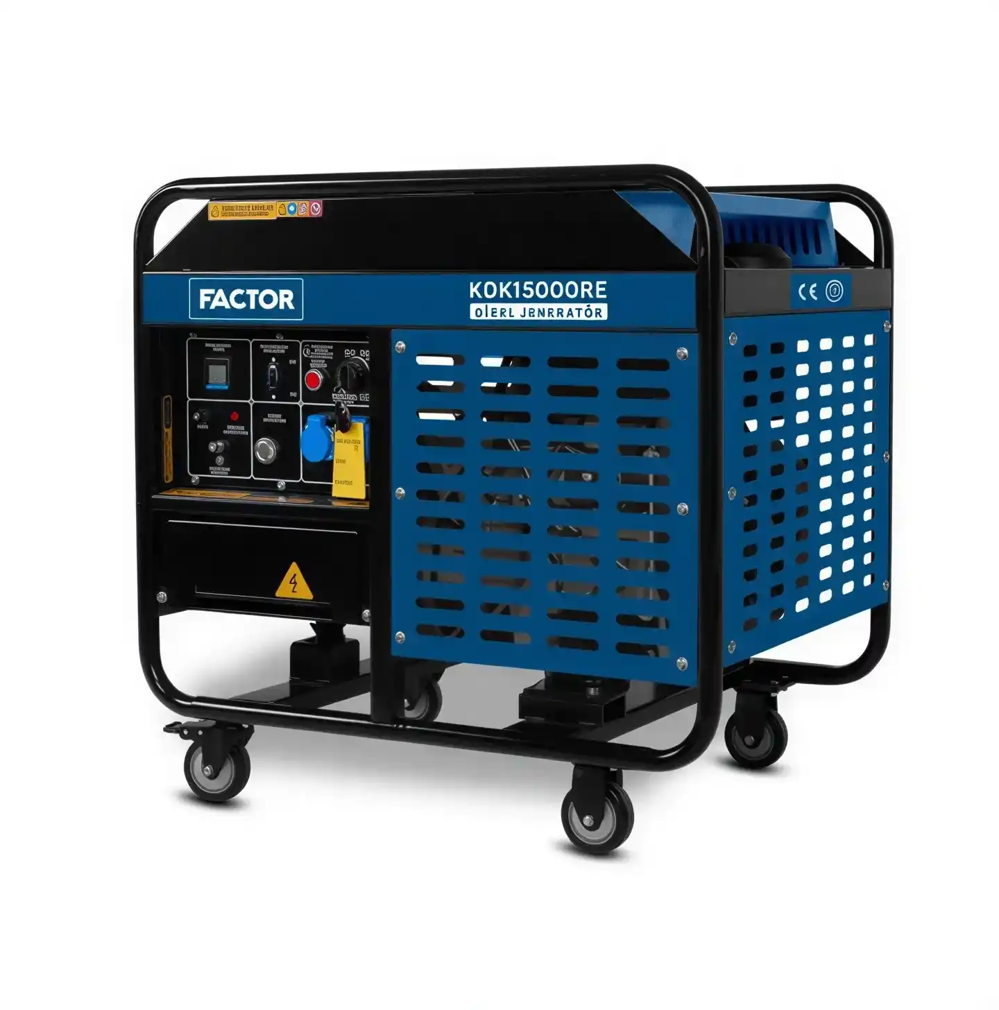Factor KDK15000RE; 15 kVA maksimum güç kapasitesi sunan, dizel yakıtla çalışan, açık şaseli ve elektrikli marş sistemine sahip profesyonel bir monofaze (230V) enerji üretim ünitesidir.
