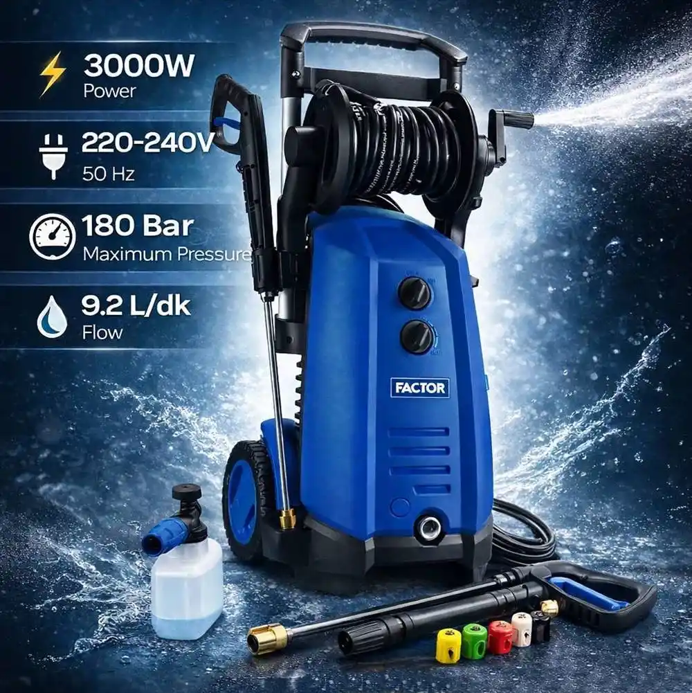 Factor PW180D Farkı: 3000 W motor gücü, makinenin zorlanmadan yüksek basınç üretmesini sağlar. Debi ve basınç dengesi sayesinde su sarfiyatını en verimli seviyede tutar.