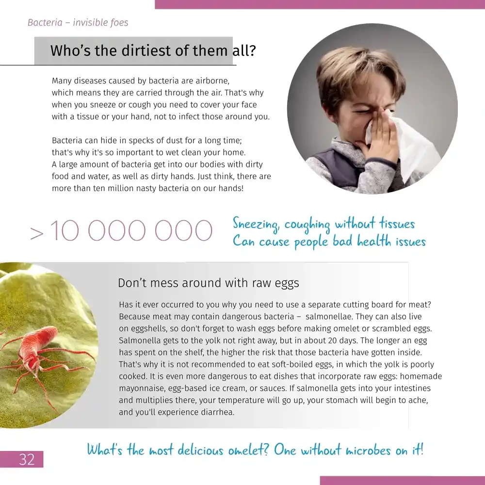 Metin basit, anlaşılabilir bir dilde yazılmıştır, bu sayede çocuklar yetişkinlerin yardımı olmadan her şeyi anlayabilir. Dikkat çekmesi için en önemli noktalar vurgulanmıştır. Fotoğraflar ve resimler metne eklenmiştir ve mikro dünyanın mikroskop altında nasıl göründüğünü gösterir.