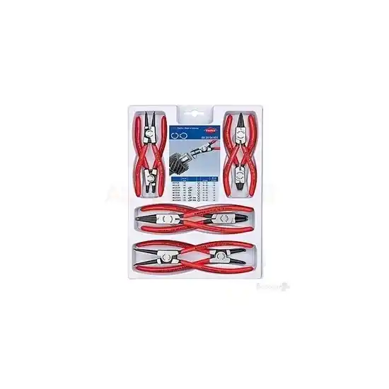 Knipex 00 20 04 V01 4 Parçalı Segman Pens Seti, kullanışlı ve sağlam yapısıyla göz dolduruyor. Bu set, yaygın mil ve delik segmanları ölçüleri için özel olarak tasarlanmış segman penseleri içermektedir.