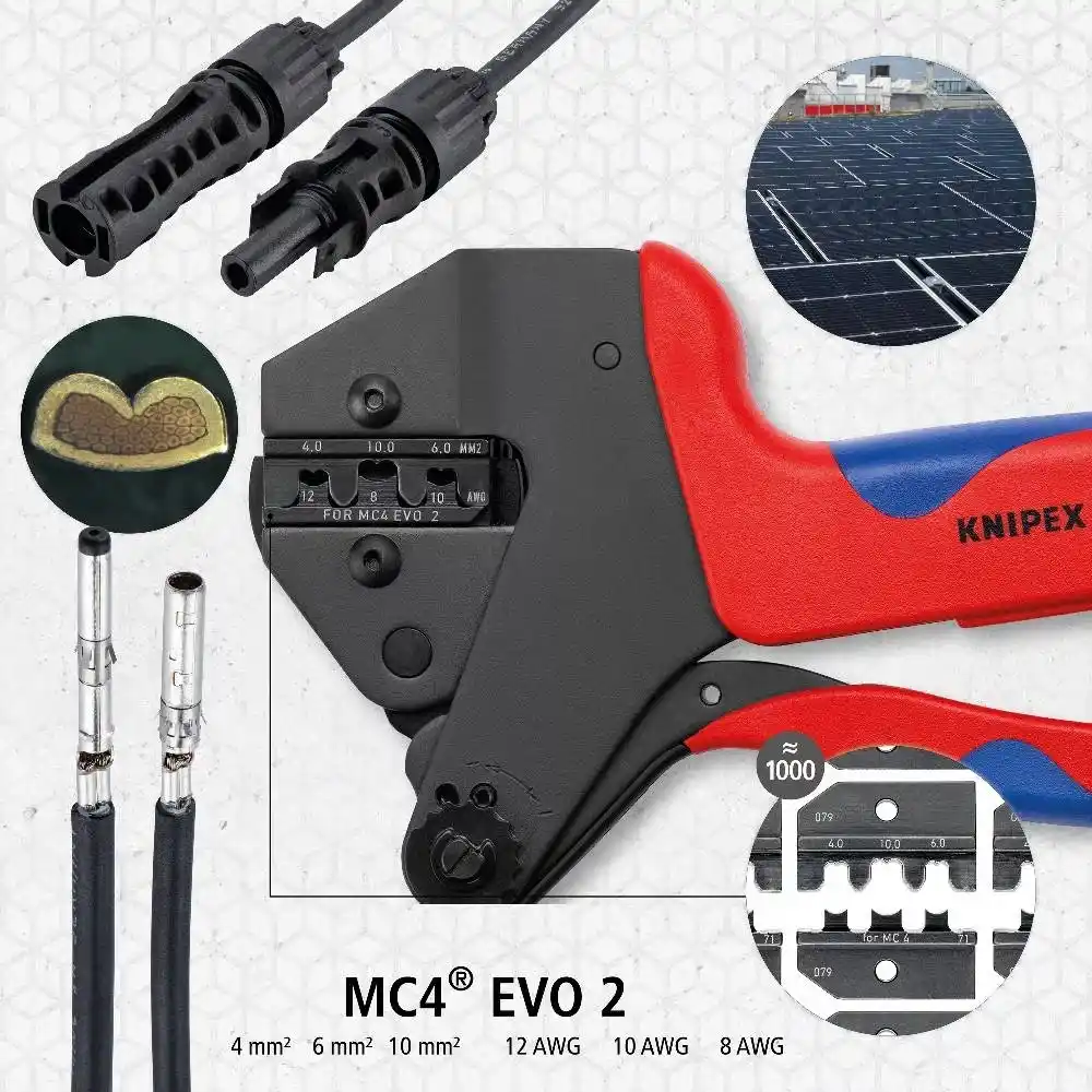 Neredeyse 1000 sıkıştırma uygulaması için tek bir alet: tüm sıkıştırma profilleri ve konumlandırma yardımcılarıyla kullanılabilir 97 49 XX Neredeyse paralel kıvırma hareketi Hassas çeneler ve kilitlenebilir (açılabilir) zorlamalı kapanma sayesinde sürekli olarak yüksek sıkıştırma kalitesi. Sıkıştırma basıncı fabrikada doğru şekilde ayarlanır (kalibre edilir) ve ayarlanabilir. Kolay kullanım için kol tahrik sistemiyle güçlendirme Tek ve çift elle kullanım için Sunulan ürün yelpazesinin dışında kalan uygulamalar için sıkıştırma uçları talep üzerine temin edilir. Özel olarak uyarlanmış sistem pensesi: MC4 EVO 2 konektörleri 4/6/10 mm² için optimize edilmiştir. Hassas konumlandırma için tutucu ile birlikte; isteğe bağlı konumlandırma yardımcısı 97 49 71 1 ile MC4® serisinin tüm solar konektörleri de takılabilir. Büyük ölçekli fotovoltaik sistemler için profesyonel standart
