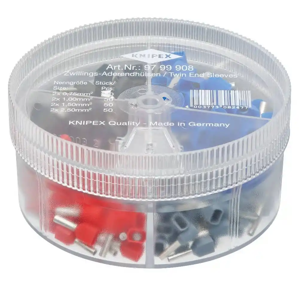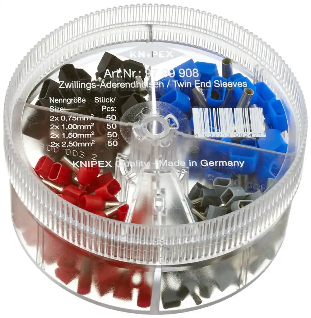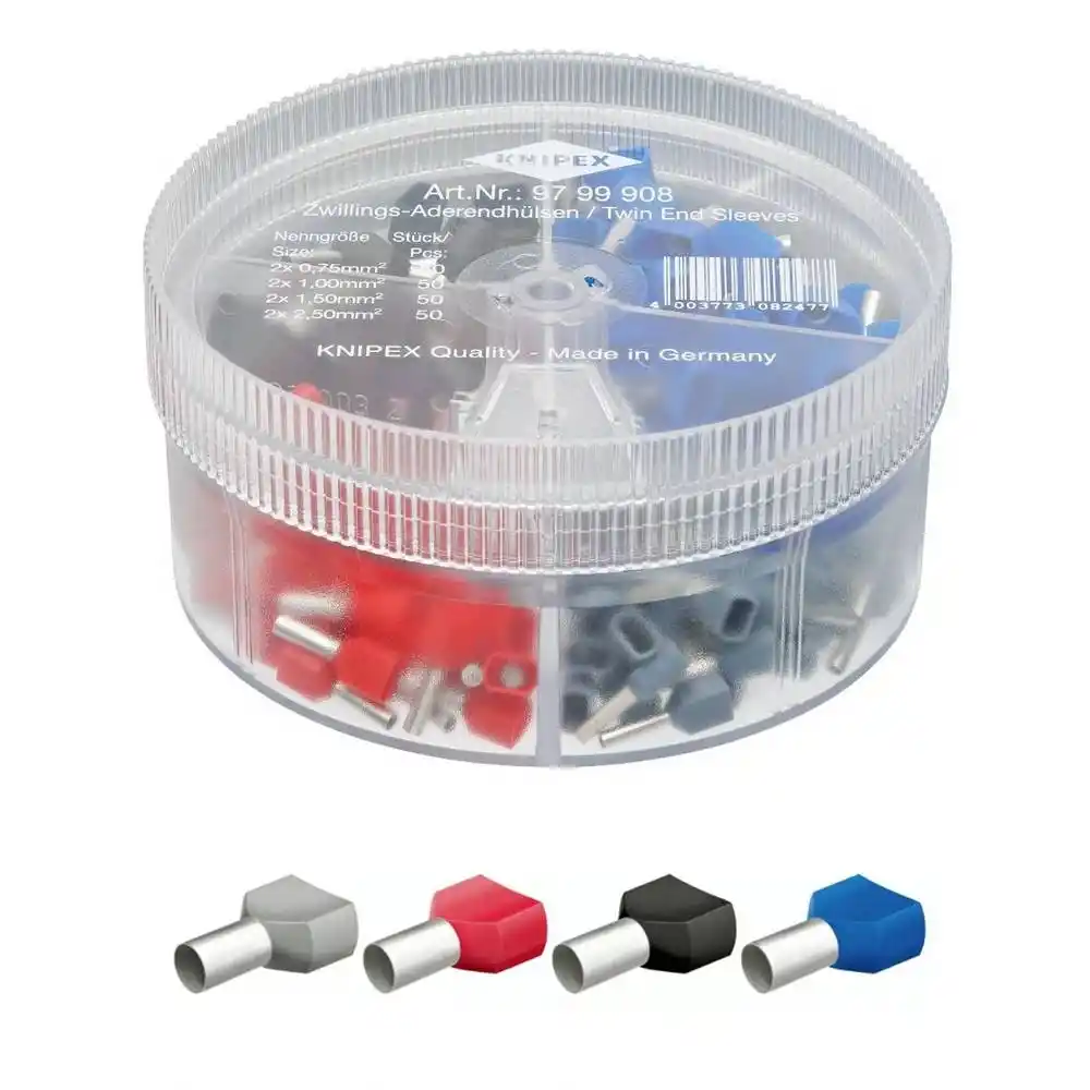 Knipex 97 99 908; 2x0.75 - 2x2.5 mm² arası 50 adet Twin (çiftli) yalıtımlı kablo yüksüğü içeren profesyonel asorti kutusudur. Güvenli köprüleme için idealdir.