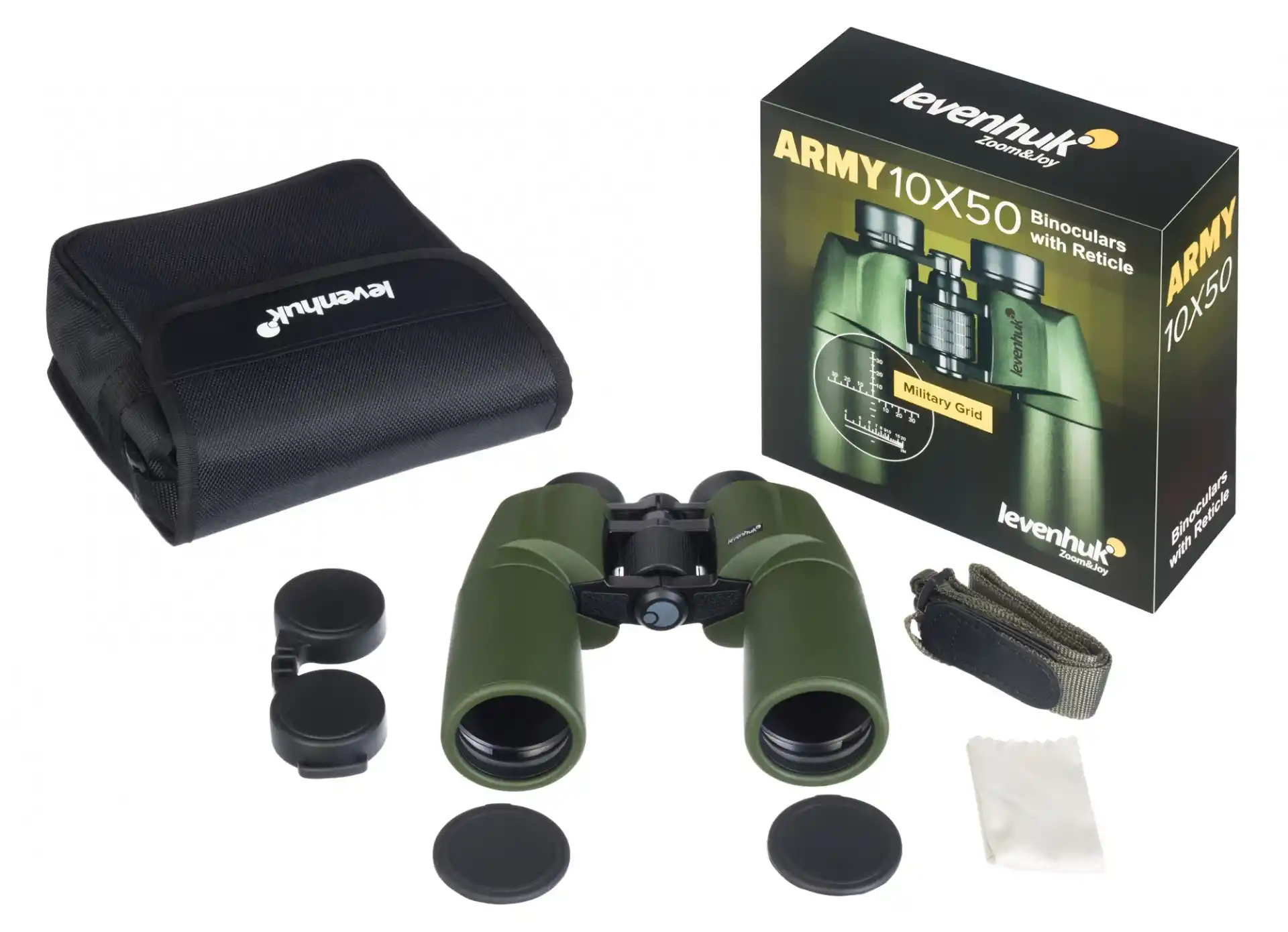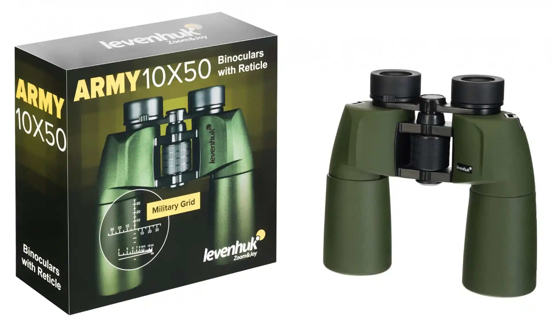 Levenhuk Army 10x50'nin optik parçaları, yüksek kaliteli BaK-4 camdan üretilmiştir ve üretilen görüntüde yüksek kontrast ve parlaklık sağlayan tamamen çoklu kaplamaya sahiptir. Merkezi odaklama tekeri büyüktür ve eliniz eldivendeyken bile döndürmesi kolaydır. Diyopter ayar halkası ve çevirmeli göz körükleri, optik parçaları kişisel ihtiyaçlarınıza göre ayarlamanızı sağlar. Gerekirse taktik gözlük ya da güneş gözlüğü takarak da rahatlıkla gözlem yapabilirsiniz.