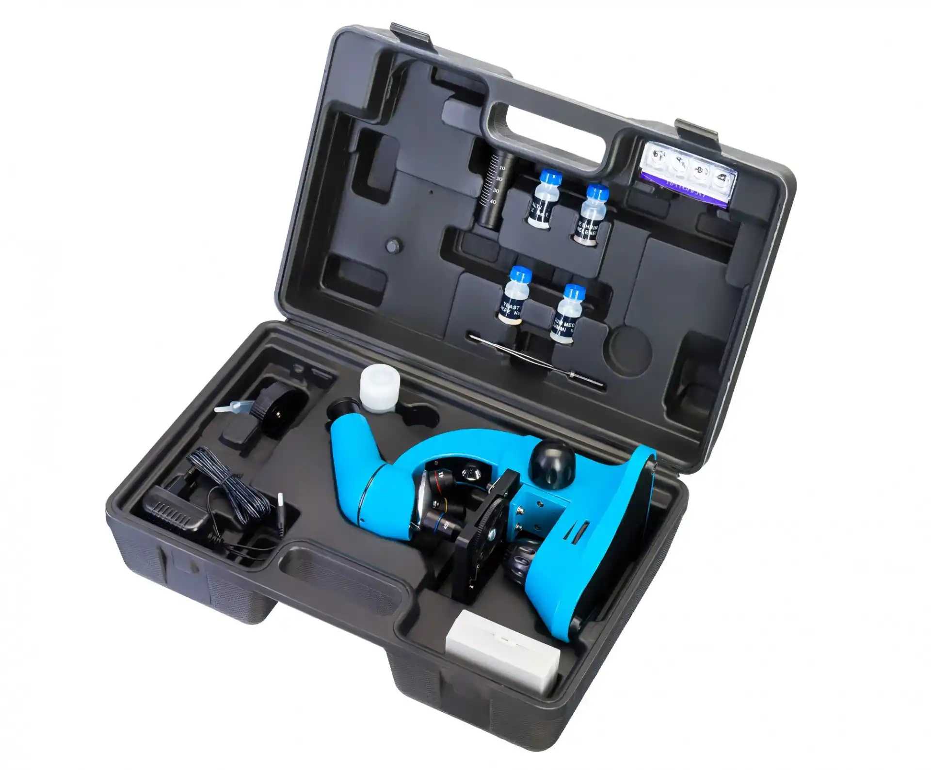 Mikroskop, bir dizi heyecan verici deney yapmanıza olanak tanıyacak bir deney setiyle birlikte sunulur. Kit, yeni mikroskopunuzu hemen deneyebilmeniz için hazırlanmış numunelerin yanı sıra kendi numunelerinizi hazırlamanız için araçları içerir. Kite dahil bir kullanışlı kullanım kılavuzu ile mikroskopun yapısı hakkında faydalı bilgiler, mikroskopla çalışma için ipuçları ve ilgi çekici deneylerin açıklamaları sunulmaktadır.