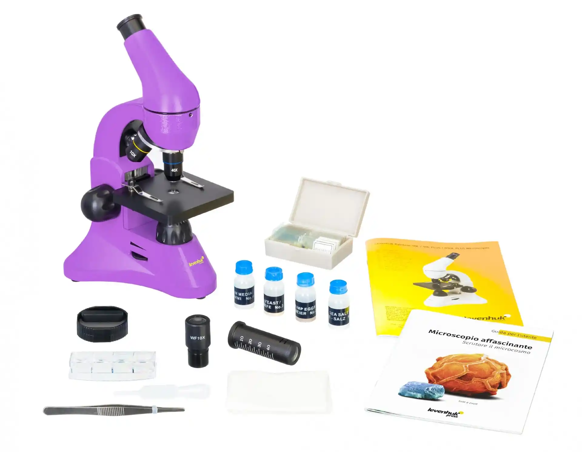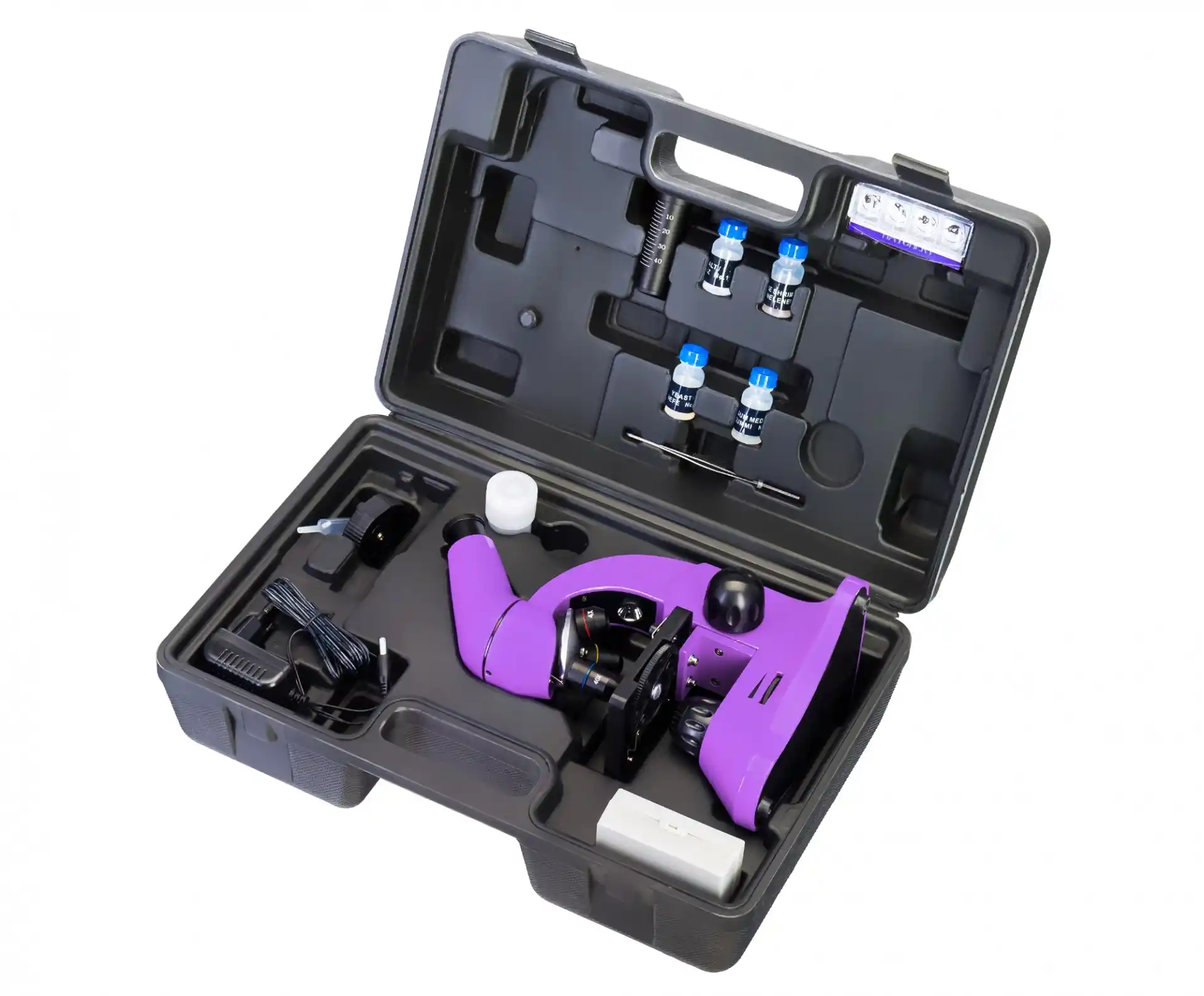 Mikroskop, bir dizi heyecan verici deney yapmanıza olanak tanıyacak bir deney setiyle birlikte sunulur. Kit, yeni mikroskopunuzu hemen deneyebilmeniz için hazırlanmış numunelerin yanı sıra kendi numunelerinizi hazırlamanız için araçları içerir. Kite dahil bir kullanışlı kullanım kılavuzu ile mikroskopun yapısı hakkında faydalı bilgiler, mikroskopla çalışma için ipuçları ve ilgi çekici deneylerin açıklamaları sunulmaktadır.