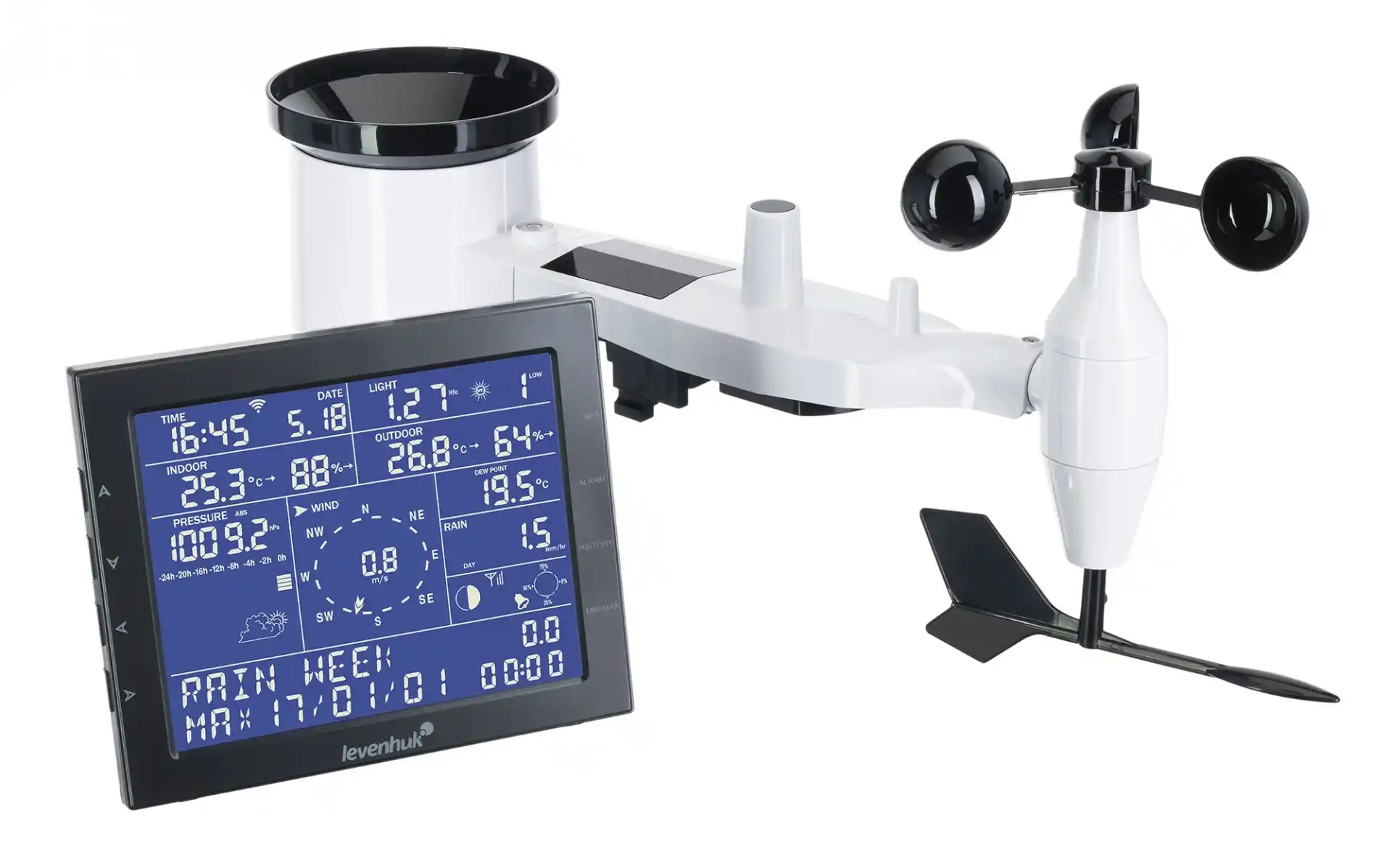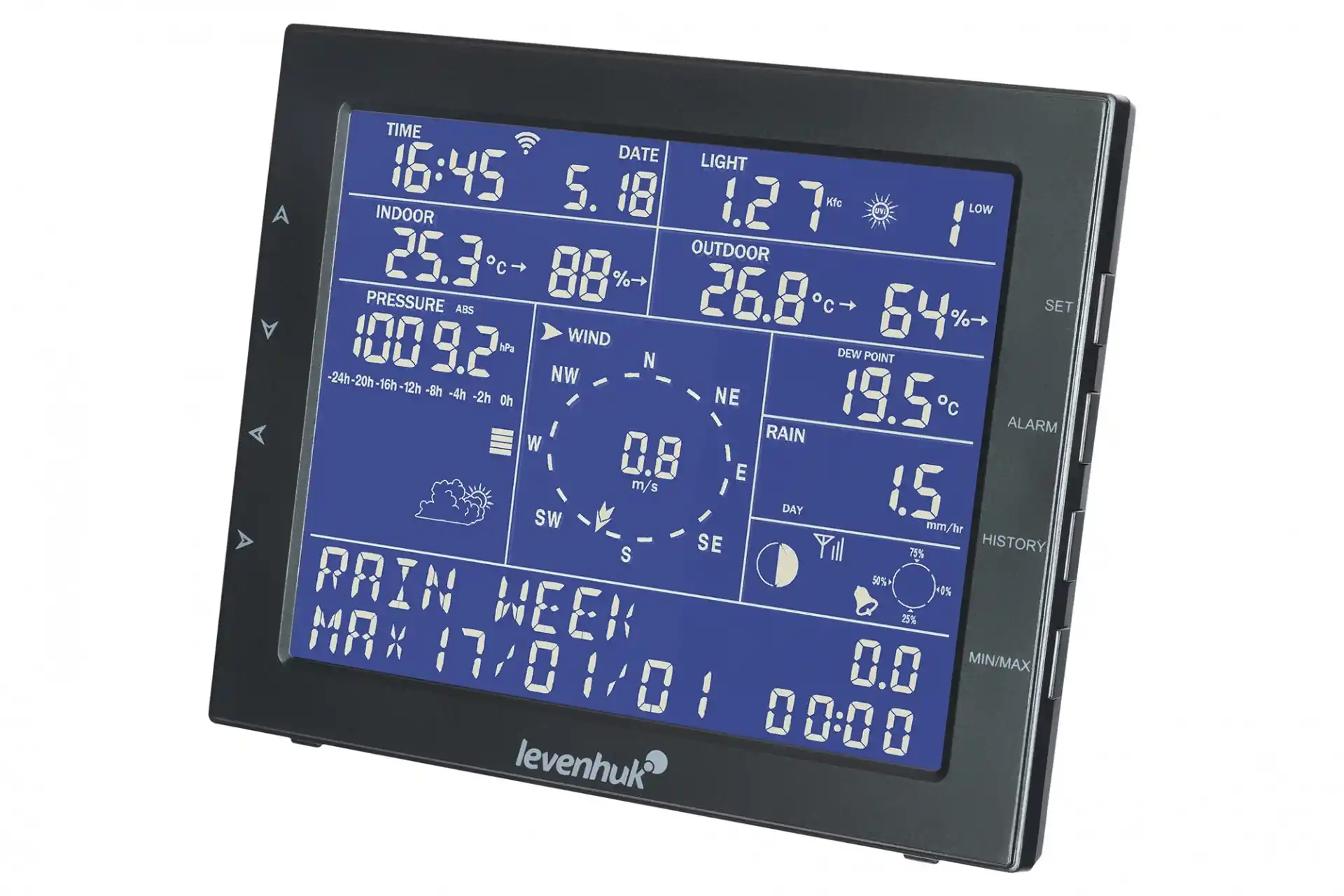 Levenhuk Wezzer PRO LP330, profesyonel bir cihazın geniş işlevselliği ve kullanım kolaylığı ile öne çıkıyor, bu da onu dış mekanlardaki hava durumunu ve iç mekanlardaki atmosferi kapsamlı bir şekilde izlemek isteyenler için mükemmel bir seçim haline getiriyor. Dış ve iç mekan hava sıcaklığını ve nemini kaydedip saklar, ayrıca sahibine atmosferik basınç, yağış seviyeleri, rüzgar yönü ve hızı, kızıl ötesi radyasyon ve çiğ noktası hakkında bilgi verir. Ayrıca istasyon, saati, çalar saati ve takvimi ayın evreleriyle değiştirebilir. Hava durumu tahmini işlevi herhangi bir kullanıcı için oldukça faydalı olacaktır.