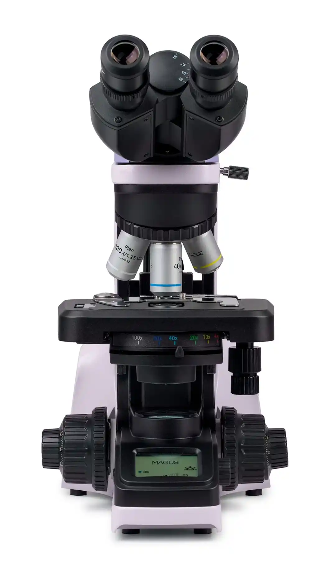 Döner burun parçasında dört objektif için yuvalar bulunur. Döner parçanın kendisi “içe doğru” yönde kullanılır: Araştırmacı çalıştırılan merceği kendi önünde görürken diğer objektifler belirli bir mesafededir. Bu düzenlemenin sunduğu avantaj, kullanıcının önünde geniş bir serbest çalışma alanı bırakmasıdır. Objektifler değiştirilirken genellikle ışık yoğunluğunda dalgalanmalar olur. Bu gözde şiddetli bir zorlanmaya ve yorgunluğa neden olur. MAGUS Bio 240B mikroskop, bu hoş olmayan etkinin önlenmesi için bir akıllı aydınlatma kontrolü sistemi ile donatılmıştır: Kullanıcı her objektif için parlaklığı bir kez ayarlar ve objektifler değiştirilirken aydınlatma otomatik olarak değiştirilir. Bir kullanışlı özellik de kullanıcının her objektif geçişinde aydınlatmayı ayarlamaya zaman harcamasının gerekmemesidir.