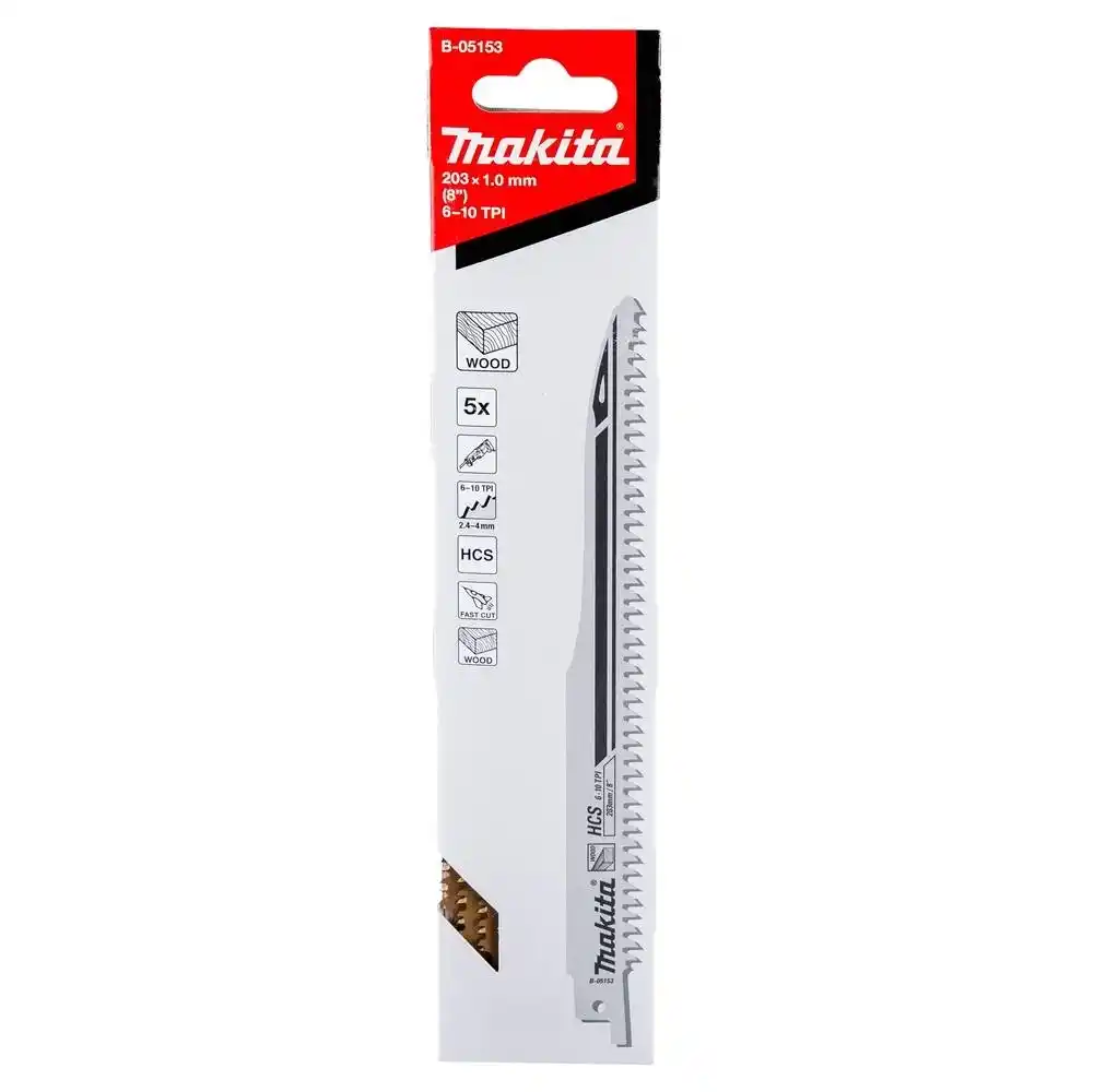 Makita B-05153; kılıç testereler için üretilmiş, 203 mm uzunluğunda, özellikle çivili ahşap ve plastik malzemelerin kesimi için optimize edilmiş, Bi-Metal (BIM) teknolojisine sahip profesyonel bir testere bıçağıdır.