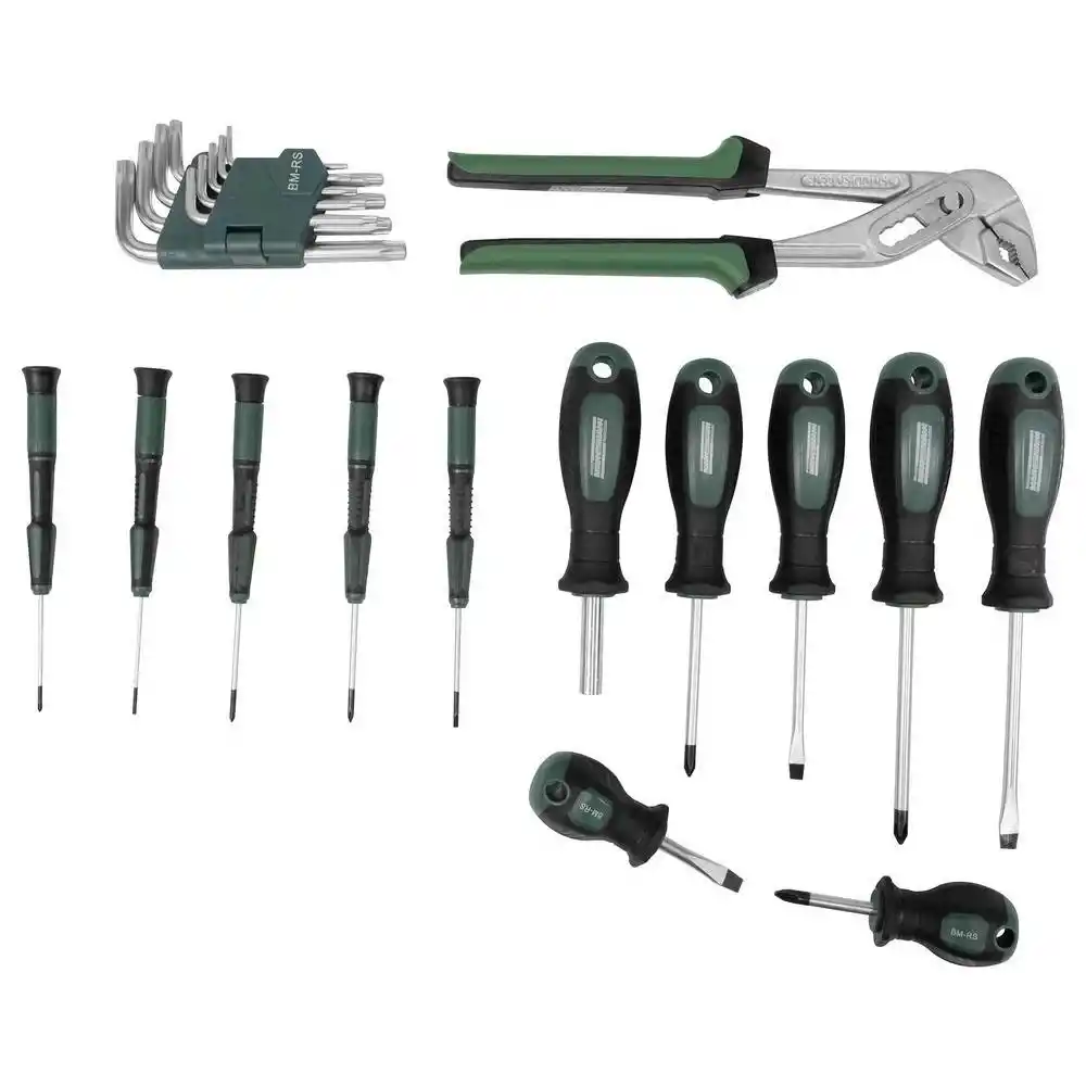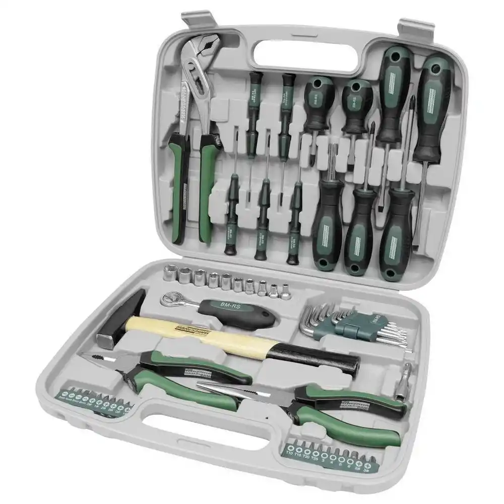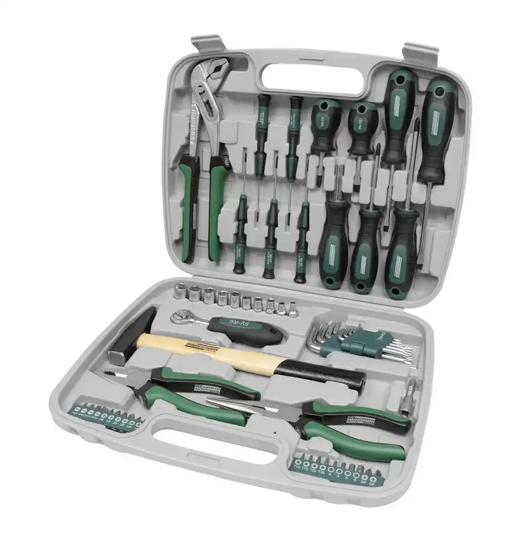 Mannesmann 29057 El Aleti Seti 57 Parça, kullanışlı bir kutuda eksiksiz alet seti. Araba, karavan, tekne ve ev içi ve çevresi için idealdir. İçindekiler: tezgah çekici, su pompası, kombine ve telefon pensesi, çeşitli atölye hassas ve karbüratör tornavidaları (düz ve Phillips PH), manyetik uç tutuculu tornavida sapı, plastik tutuculu Torx anahtarlar, uzatmalı 1/4" cırcır ve 10 lokma anahtar ve Phillips PH ve PZ, Inbus, Torx ve düz uçlu kapsamlı bir uç seti.