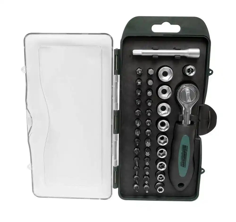 Mannesmann 29891; 1/4" (6.3mm) sürücü sistemine sahip, yüksek kaliteli Krom-Vanadyum (Cr-V) çeliğinden üretilmiş, hem lokma anahtar hem de vidalama uçlarını içeren kompakt bir profesyonel el aleti setidir.