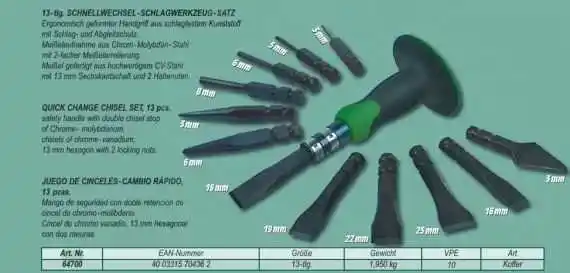 ● 13 parça keski-murç seti ● Krom vanadyum malzemeden mamul keski ve murçlar ● Çift kilitli kaymaz yumuşak sap ● Ağırlık: 2.1 Kg ● Plastik kutu ölçüleri : 34.6 x 13.4 x 6.6 cm