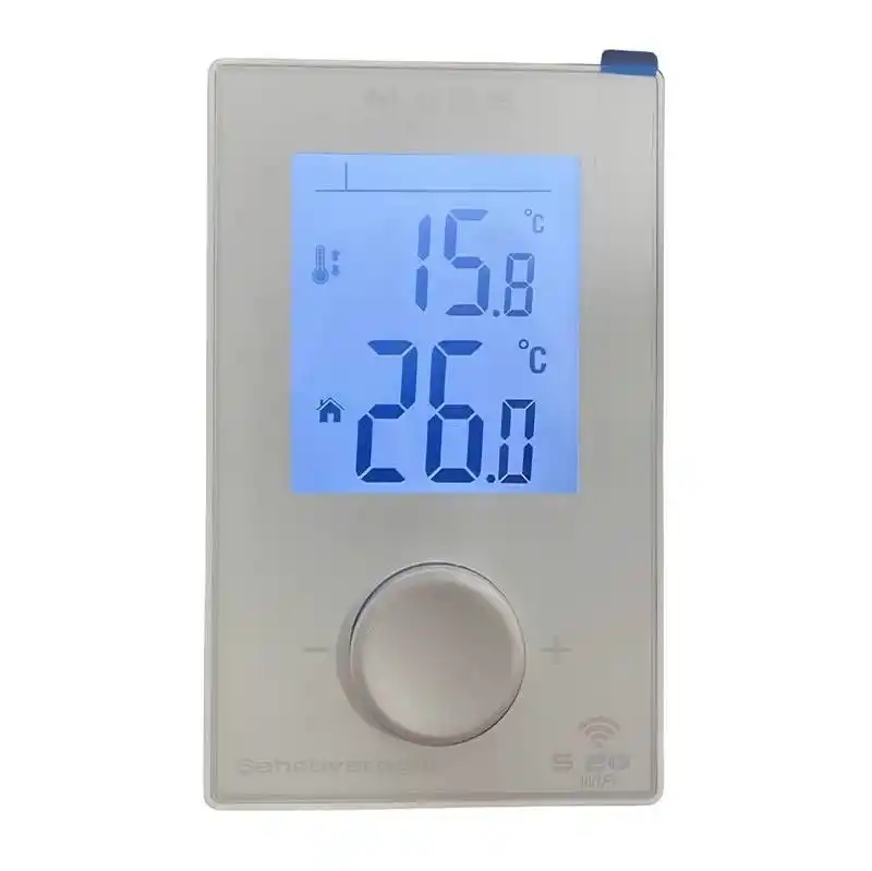 Büyük tip ışıklı dijital göstergeli programlama yeteneği olmayan bir oda termostatıdır.
