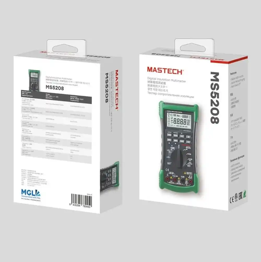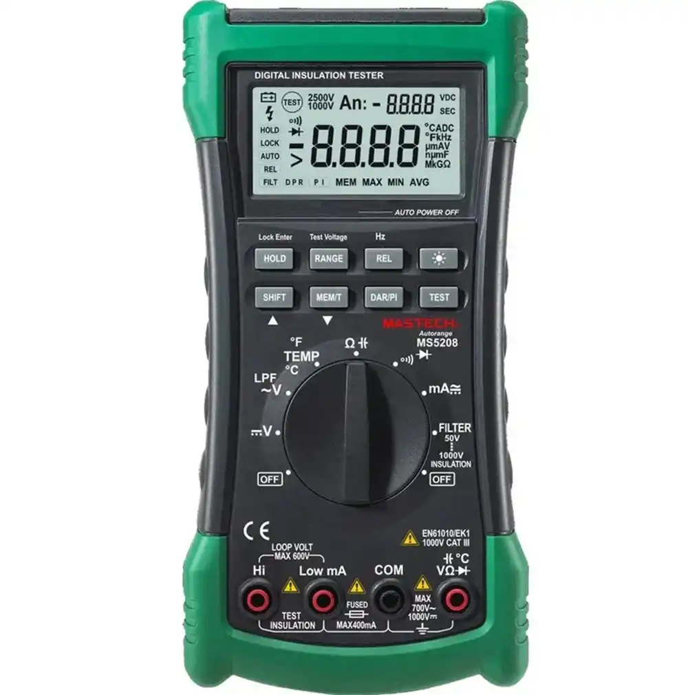 | İzolasyon | 50V : 0~ 50MΩ, ±3.0%, 100V: 0~100MΩ, ±3.0%, 250V: 0~250MΩ, ±3.0%, 500V: 0~500MΩ, ±3.0%, 1000V: 0~ 2GΩ, ±3%~10% Sesli ikaz & diot testi |