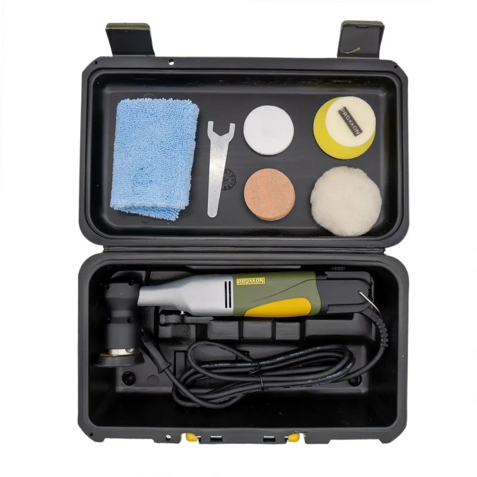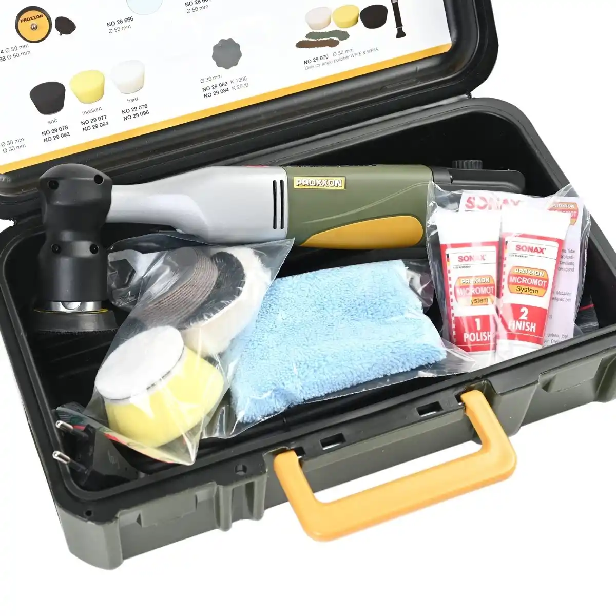 Teslimat içeriği Orbital polisaj makinası Plastik taşıma çantası Cırtlı lastik destek taban diski, Parlatma süngeri (orta sert), Kuzu yünü parlatma diski, Parlatma keçesi (orta sert), 12 Adet zımpara diski K2000, Mikrofiber bez ve alet değişimi için anahtar.