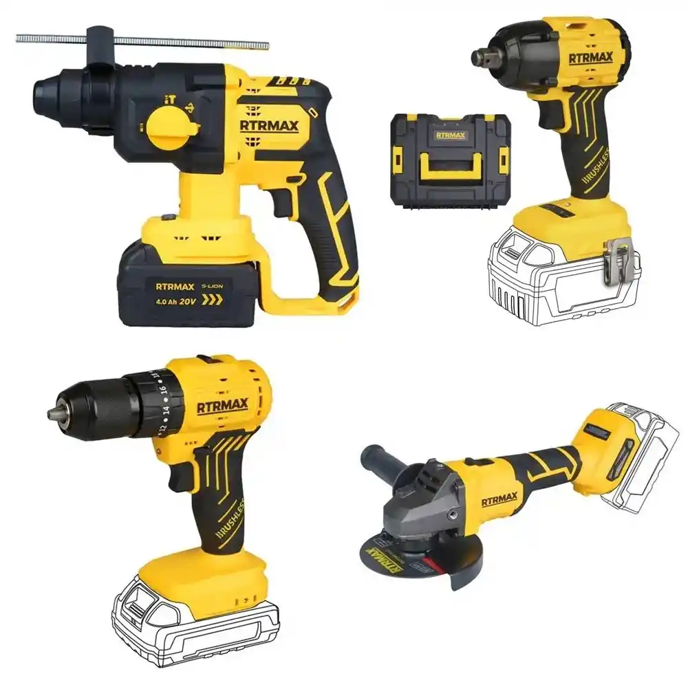Rtrmax X-Lion 4’lü Set, bir teknisyenin veya ustanın sahada karşılaşabileceği en zorlu görevler (beton kırma, metal kesme, somun sökme-takma) için bir araya getirilmiş tam teşekküllü bir makine grubudur. Set içerisinde; darbeli delme işleri için Matkap, beton kırma için Kırıcı Delici, metal profil işleri için Avuç Taşlama ve yüksek tork gerektiren cıvata işleri için Somun Sıkma makineleri yer alır.