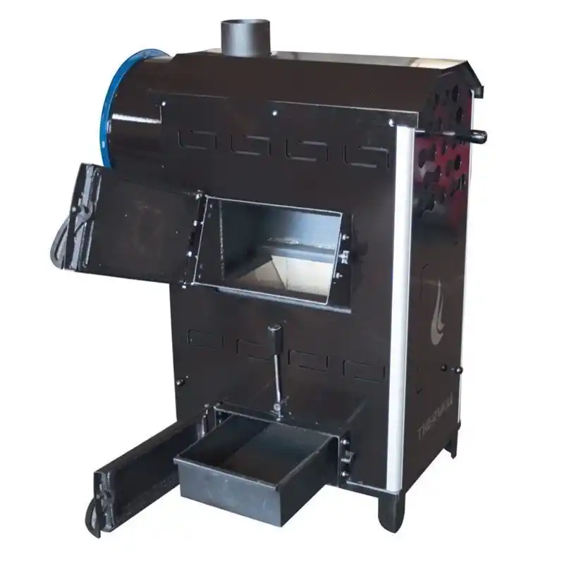 Thermall T-100 Myis Katı Yakıtlı Fanlı Üflemeli İş Yeri Sobası, 100.000 kcal/h ısıtma kapasitesi ile iş yerlerinizde konforlu ve verimli bir ısıtma deneyimi sunar.