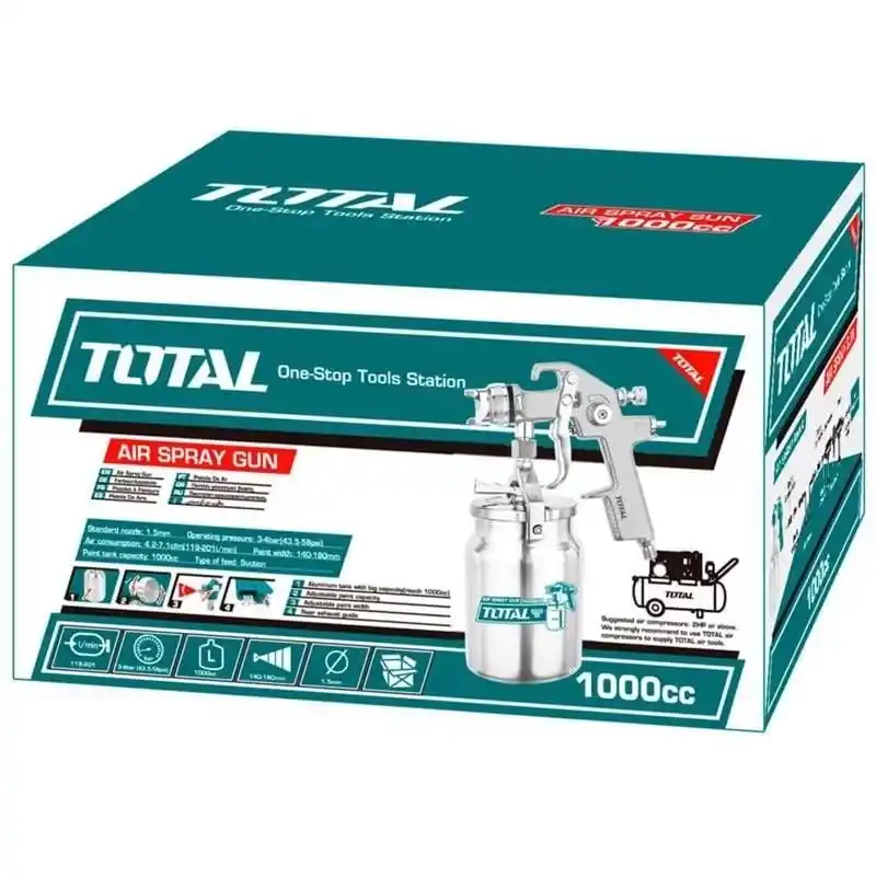 Total TAT11002 Alttan Depolu Havalı Boya Tabancası 1.8mm modeli 1.8mm çapındaki nozulu ile istenilen genişliğe ayarlanabilir ve böylece farklı boyutlardaki yüzeylerin boyanması için idealdir. Ayrıca 1000cc kapasiteli haznesi sayesinde daha uzun süre kesintisiz olarak çalışabilirsiniz.