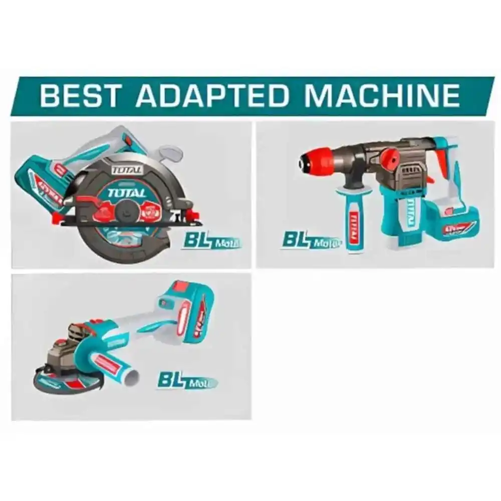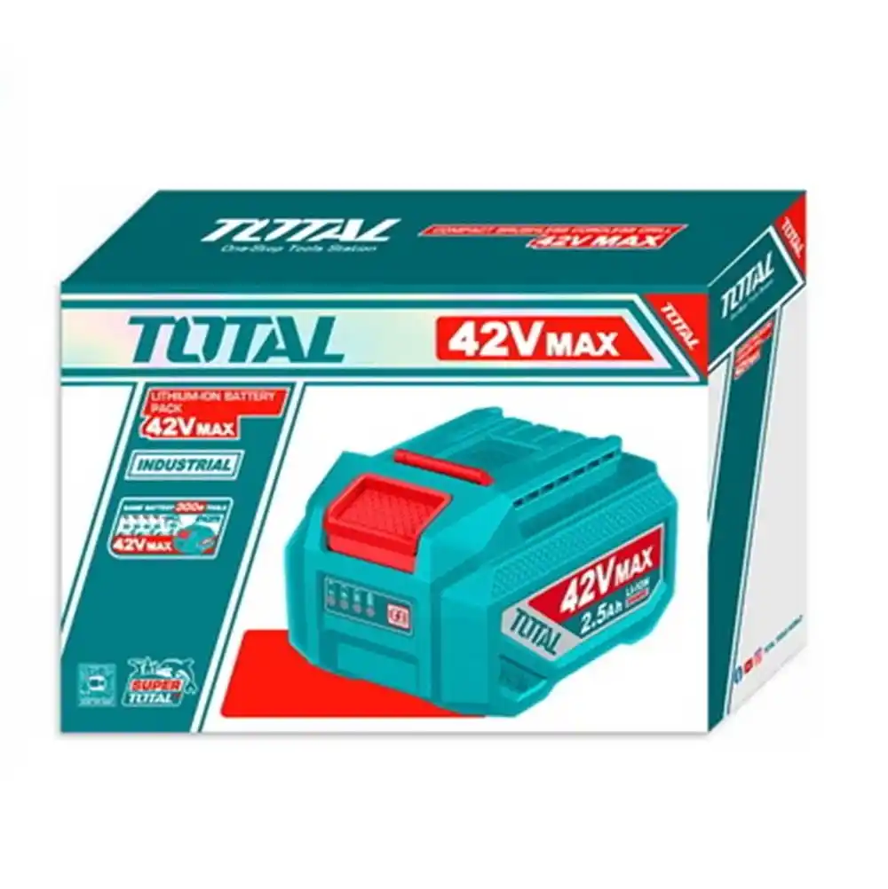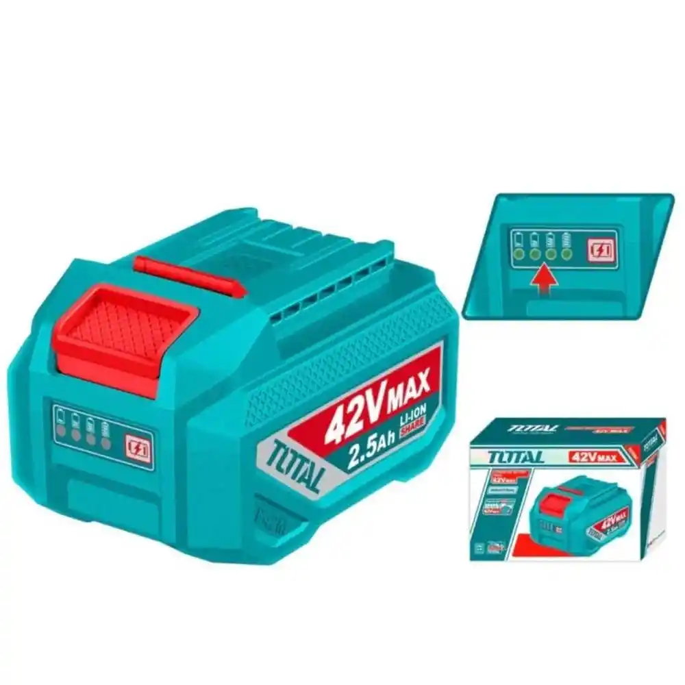 Total TFBLI42251E; 42V endüstriyel platformdaki kablosuz el aletlerine enerji sağlayan, yüksek yoğunluklu lityum-iyon hücre yapısına sahip, 2.5 Amper-saat kapasiteli profesyonel bir yedek güç ünitesidir.