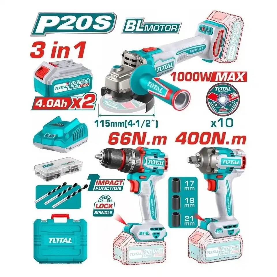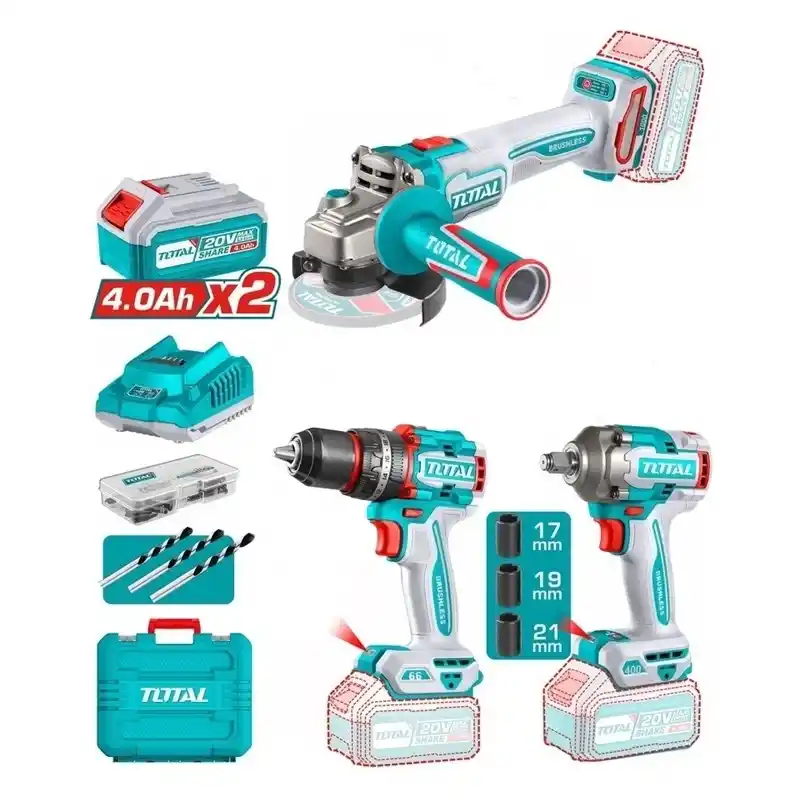 Teslimat Kapsamı 1 Adet Total Akülü Avuç Taşama 1 Adet Total Akülü Somun Sıkma 1 Adet Total Akülü Darbeli Matkap 2 Adet 4.0 Ah Batarya Akü 1 Adet Hızlı Akü Şarj Cihazı 1 Adet Taşıma Çantası Muhtelif Aksesuarlar