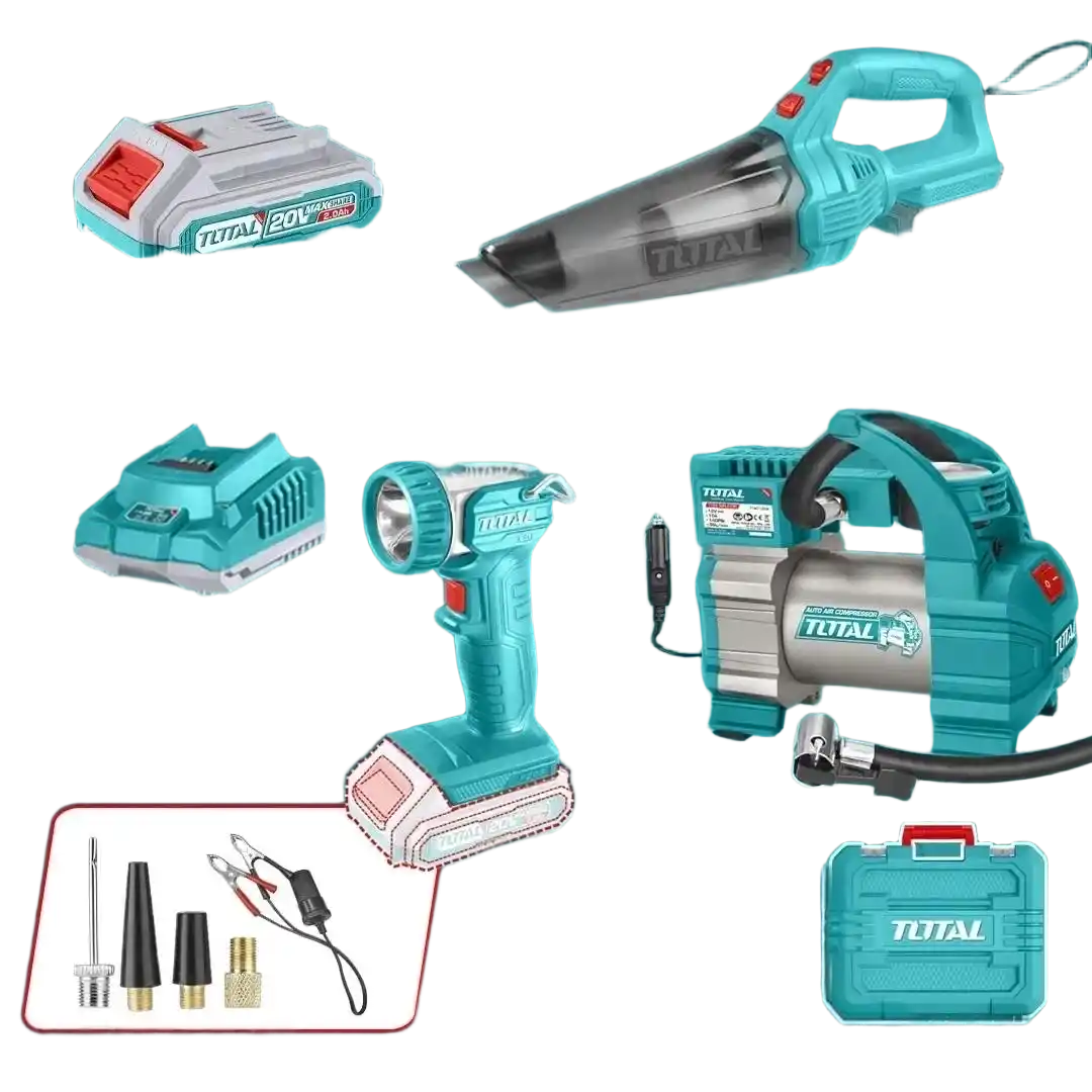Total TOZLI20306, araç içi temizlik, lastik basınç yönetimi ve acil durum aydınlatma ihtiyaçlarını tek bir batarya ekosisteminde birleştiren, 20V Max Share teknolojisiyle güçlendirilmiş profesyonel bir mobil destek setidir.