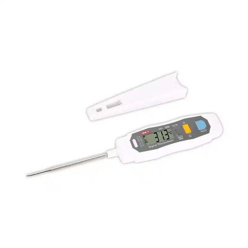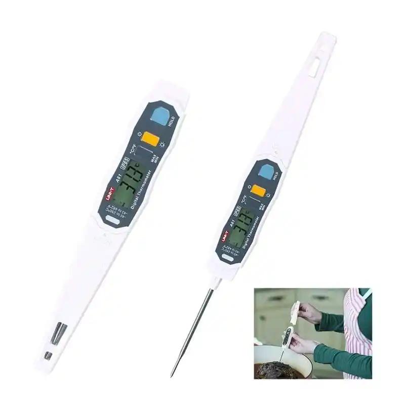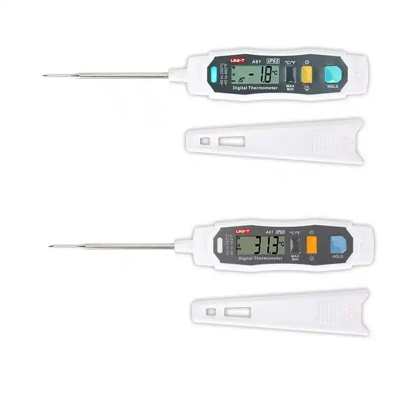 Uni-t A61; gıdaların, sıvıların ve yarı katı maddelerin iç sıcaklığını yüksek doğrulukla ölçen, paslanmaz çelik proba ve IP65 su geçirmezlik sertifikasına sahip profesyonel bir dijital termometredir.