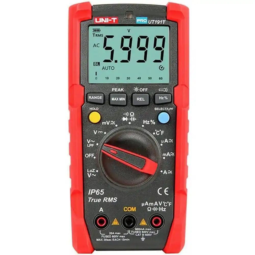 Uni-T UT191T, en zorlu endüstriyel sahalarda True RMS hassasiyetiyle ölçüm yapabilen, IP65 toz ve su koruma sertifikasına sahip, profesyonel sınıf bir dijital multimetredir.