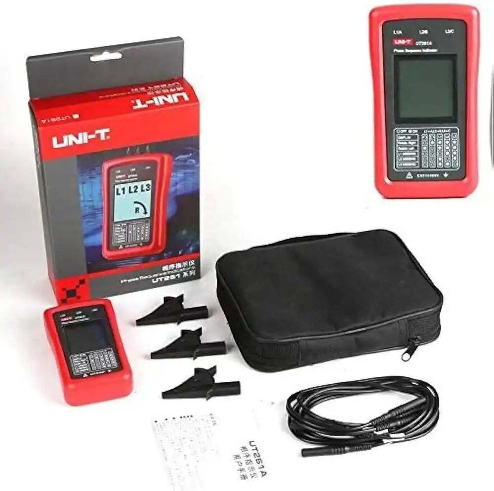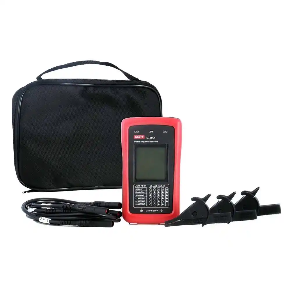 Uni-T UT261A, üç fazlı elektrik sistemlerinde faz sırasını ve motor dönüş yönünü LCD ekran üzerinden görsel olarak belirleyen, harici bir güç kaynağına ihtiyaç duymadan test edilen devreden beslenen profesyonel bir ölçüm cihazıdır.